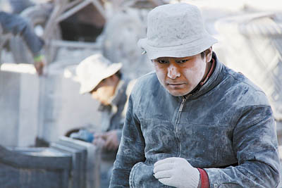 “2008年以前厂里有100来个工人呢”,这家工厂的老板张杰说,“金融危机一来外国订单就少了,就不需要那么多工人了。现在厂里还剩下30人吧。”提到自己的小儿子,张老板不希望他将来再干这一行。“现在生意越来越不好做了,原料涨价,工人越来越少。年轻人都去城里打工,留在农村的宁愿务农或者开车拉煤,也不愿干雕刻。工人的工资都涨了,一人一天起码要有150~200元,不涨就更没人干了。而且做雕刻太脏,每天会吸进大量粉尘,容易得肺病。整天跟石头、石刀打交道也容易受伤。听说这些石头还有辐射呢。”