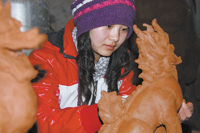 11月24日,农历十月十九,正赶上曲阳的大庙会。18岁的学徒吕小帅说:“我们平时没有周末,‘五一’、‘十一’都不放假,但是每次庙会的第一天肯定是要放的。”他初中毕业后不愿像父辈那样再从事石雕行业,而选择学习泥塑。“和雕刻厂不一样,泥塑厂除了做成品以外,还给雕刻厂做模型和设计,比较有技术含量吧,而且用泥做塑像,干净多了。”同龄人中干石雕的越来越少了,他们都知道天天吸进石沫儿不健康。
