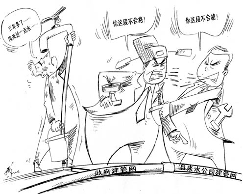 由于政府与水厂互掐,政府建的管网,自来水公司“验收”不合格,致使浙江苍南灵溪镇500多村民断水三年,崭新的自来水管铺到了家门口1年了却放不出一滴水。(《钱江晚报》11月30日)
