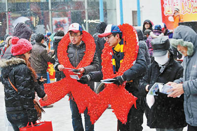 11月28日,辽宁沈阳,在第23个“世界艾滋病日”即将来临之际,来自沈阳药科大学、辽宁大学等学校的近百名大学生志愿者走上街头向居民发放宣传单、安全套,宣传艾滋病预防知识。