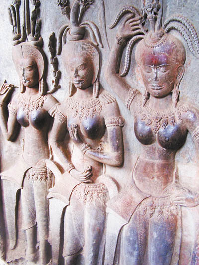 日出后的吴哥寺最适合漫步回廊,去欣赏繁复精美的浮雕。东壁的搅乳海图,北壁的毗湿奴与天魔交战图,西壁的猴神助罗摩作战图等,均描绘神话故事;而南壁西半部的苏利耶跋摩二世骑象出征图则为世俗题材。浮雕手法精湛,场面复杂,人物生动,形象逼真,漫步其中,如同观看一场关于千年前真腊王朝的电影。而寺庙中随处可见的形态各异的女神,则平添了几分鲜活的动感。这些女神雕像婀娜多姿,表情生动,栩栩如生,服饰发式各异,历经千年依旧保持着俏皮和妩媚,仿佛时光从不曾留下痕迹,寂静的回廊中隐隐有银铃般的笑声。在任何一个角落坐下,静静感受这安静而又充满动感的吴哥寺,其中的生命力如同热带的植物般生生不息,延续千年。