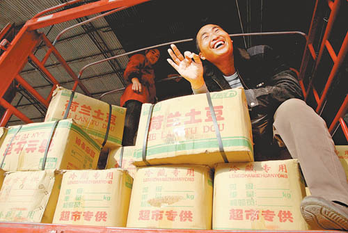 12月1日,安徽淮南市人民路农副产品批发市场的经营户在卸载从外地运来的新鲜土豆。国家发展和改革委员会、交通运输部和财政部宣布,从今年12月1日起,全国所有收费公路(含收费的独立桥梁、隧道)全部纳入鲜活农产品运输绿色通道网络范围,对整车合法装载运输鲜活农产品车辆免收车辆通行费。