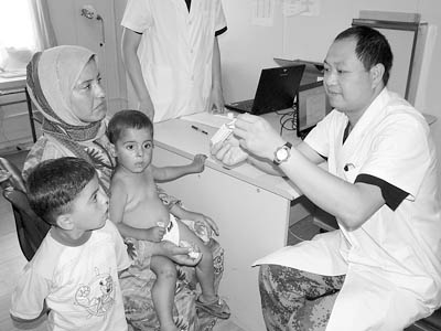 中国赴黎维和医疗队医疗人员对当地百姓进行人道主义救助。