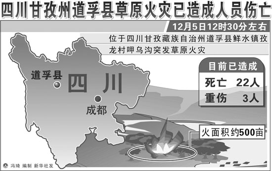 本报成都12月5日电(记者王鑫昕)12月5日中午,四川省道孚县发生草原火灾。由于在处理余火时突起大风,原本已经被控制住的大火重新燃起,将灭火人员包围,造成22人遇难,3人重伤,1人轻伤。