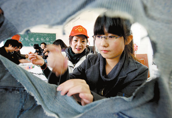 12月2日,安徽省淮北供电公司青年志愿者在淮北师范学院教大学生练习缝补技艺。当日,青年志愿者到淮北师范学院开展“节约低碳进校园”活动,倡导节约、低碳生活从身边的小事做起,教大学生们缝缝补补、旧物利用等,迎接第25个世界志愿者日到来。王文摄