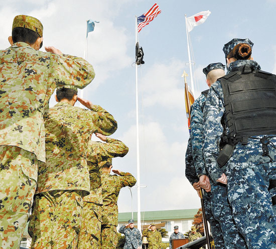 图为日美官兵在驻日美国海军佐世保基地举行基地警备训练开幕式。新华社/共同社