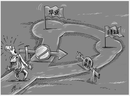 重庆江北一家高职院校旅游管理专业的应届毕业生“被组织”去旅游,不仅每人需要支出400块钱,这还影响到部分同学正在进行的实习。(《重庆晨报》12月6日)漫画:徐简