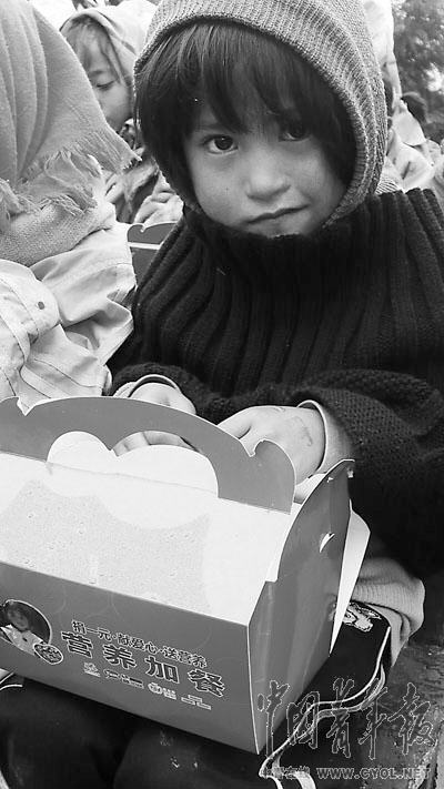 云南省寻甸县甸沙乡噜六小学,一名小学生手拿“捐一元·献爱心·送营养”活动赠送的营养加餐。从2010年12月开始的一年时间,该小学的180多名学生都将每人每天获得一盒牛奶和一个鸡蛋的营养加餐。