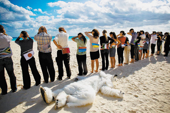 12月4日,墨西哥海滨城市坎昆,环保主义者在海滩举行仪式“悼念”北极熊。11月29日至12月10日,坎昆世界气候大会(《联合国气候变化框架公约》第16次缔约方会议)在墨西哥海滨城市坎昆举行。CFP/供图