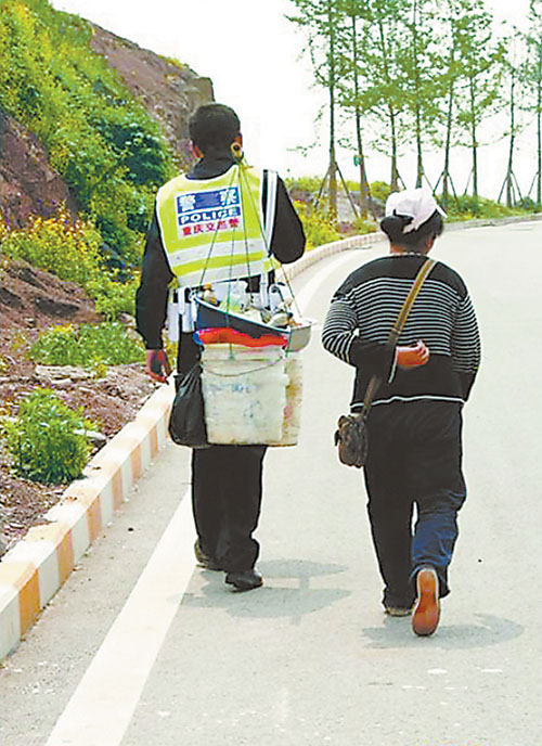 就这样,一名交巡警挑着凉面担子往前走,大妈在旁边捶腰。这个场景被网友拍下,发到了互联网,“最美背影”交巡警一夜之间在网络迅速走红。发帖人称,“这位警察大哥见这位大妈腰不好,上坡困难,就帮忙挑了一段,照片虽然仅仅只有5张,却向世人展示了一名重庆警察的最美背影,看到了重庆和谐融洽的警民关系,让人感到无比的欣慰。”国内多家网站纷纷转载此帖,当晚仅中华网上对此帖的点击量就接近40万,有800多名网友发表回复,全是对重庆交巡警的赞誉之声。“最美背影”交巡警作为重庆交巡警亲民爱民的缩影,深入民心。