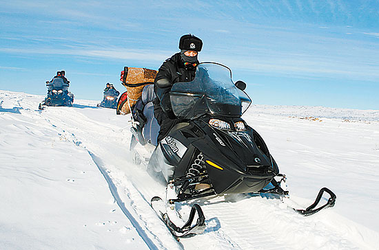 12月8日,新疆阿勒泰市有关部门工作人员骑着雪地摩托为被困农牧民及关卡工作人员送去生活物资。