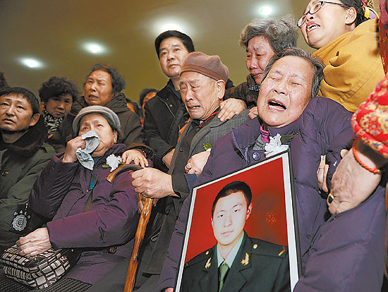 12月10日,在重庆九龙坡区殡仪馆,王远鹏烈士的外婆陈其芳怀抱外孙的照片悲痛欲绝。