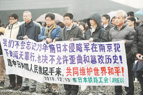 12月13日,东日本铁路工会的代表参加和平集会。当日,南京各界人士在侵华日军南京大屠杀遇难同胞纪念馆集会广场举行“悼念侵华日军南京大屠杀30万同胞遇难73周年仪式暨南京国际和平日集会”。来自中国、日本、俄罗斯等国家的5000多人参加了集会。