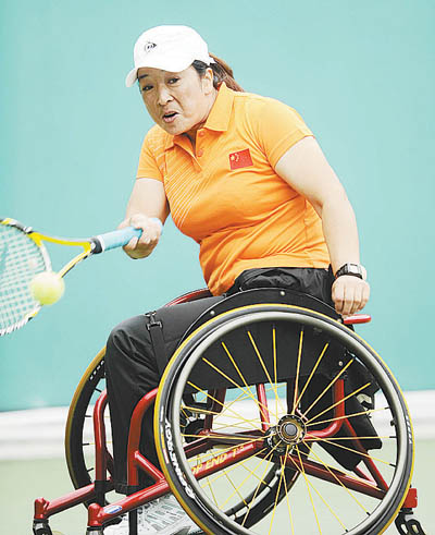 12月14日,中国选手董福利在亚残运会轮椅网球女单1/4决赛中,以2∶0战胜中华台北选手吴宜珊。