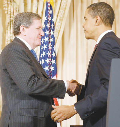 图为霍尔布鲁克(右)2009年1月22日在白宫与刚就任美国总统的奥巴马握手。