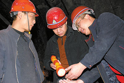 中铁二十一局集团三公司董事长兼总经理赵春锋(中)亲临隧道掌子面查看围岩石质变化情况