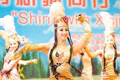 12月17日,“与新疆同行”专题系列活动开幕式在北京钓鱼台国宾馆举行。出席开幕式的外国驻华使节、非政府组织和企业代表参观了反映新疆发展成就、自然风光、民族文化以及北京市等省市对口援疆情况的图片展,欣赏了具有新疆各民族风情的歌舞演出,品尝了新疆的美味佳肴。这是开幕式上的民族歌舞表演《离太阳最近的人》。