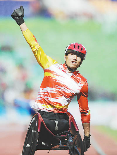 12月18日,中国队夺得亚残运会田径男子4×400米接力T53/54级比赛冠军。图为中国队最后一棒选手刘成明冲过终点后庆祝。