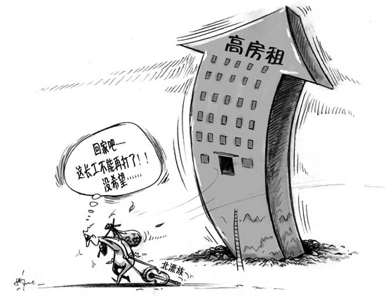 目前北京城区与郊区共有可出租房屋约240万套,有租赁需求的人口约700万人,而1~11月北京普通住宅房租价格为3179元,同比上涨23%。因此,部分北漂拟回老家。(中国广播网12月19日)漫画:徐简