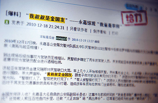 这是百度快照里保存的《“我叔叔是金国友”——永嘉惊现“我爸是李刚”》原始帖子(12月21日摄)。日前,温州爆出“我爸是李刚”的相似版,酒驾又打交警的肇事者金建兄扬言:“我叔叔是金国友!”20日傍晚,金建兄自首,警方对其处以行政拘留20日。新华社记者 韩传号摄