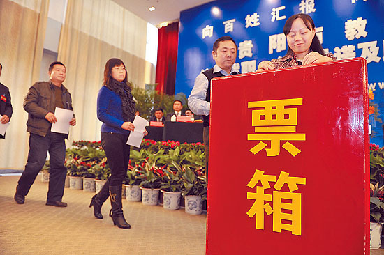 12月21日,市民在民主评议工作大会现场投民主评议表。