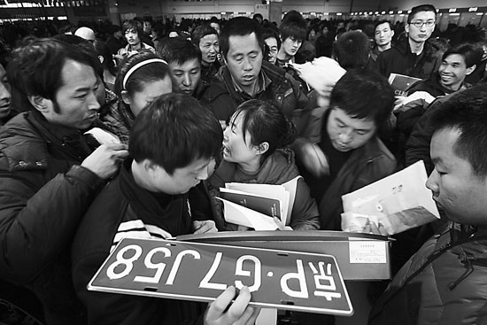 “限牌令”出台令京城众多汽车经销商彻夜不眠,接受消费者的购车和订车,以便尽早提交报表,使最后一批消费者不用摇号。图为北京花乡机动车交易市场,办理购车手续的场面热火朝天。一层过户大厅内,人们在取号机前争相取号。吕家佐摄