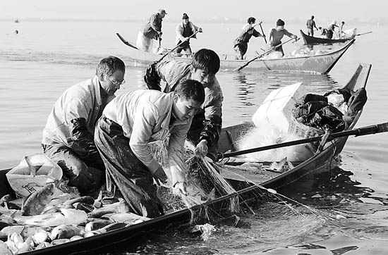 12月25日,渔民在星云湖中捕鱼。当日,云南省江川县举行“开渔节”,千舟万人划向星云湖中捕鱼。江川年均鱼交易量达1万吨,助推当地群众大幅增收。新华社记者 杨宗友摄