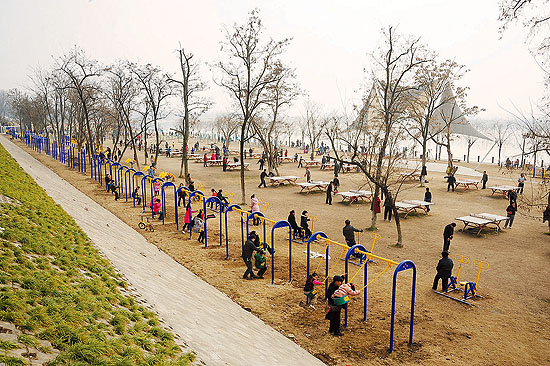 以汉江为轴心连接汉江两岸城区的江滨公园,总长2.8公里共建有9个羽毛球场,9个篮球场,1个乒乓球运动区,1个运动健身区,1个运动休闲区,1个门球场,1个儿童健身游乐区,1个健身长廊,安装器材544件,总投资205万元。