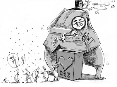 近日,江苏淮安市楚州区教育系统的职工均接到通知,要求参加区里号召的“送温暖、献爱心”慈善捐赠活动,同时,通知还明确了捐款的具体数额,每人捐款不得少于200元。(中新网12月29日)