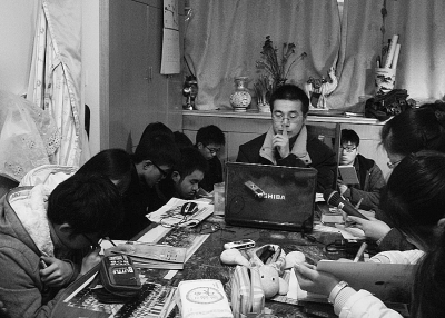 晚上6点刚过,学生们开始陆陆续续到达樊阳家。在一个不到20平方米的房间里,局促地挤着一张大圆桌和十几把式样各异的椅子。书柜和写字台上摞着厚厚的书本,旁边却靠墙立着一把红蓝相间的儿童玩具车。