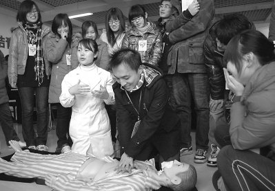 1月17日,春运志愿者在学习心肺复苏急救知识。