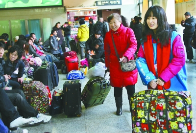 1月19日,北京西站候车室,来自北京城市学院的春运志愿者正安排一位老年旅客就座。