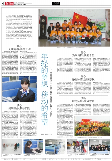 年轻的客服人,用诚挚的语言和真心的沟通,赢得了客户的心,他们主动承担责任,大胆融入社会,坦诚面对未来,与时俱进,提高素质,完善自我,用丰富的知识证明自己的价值,展示中国移动辽宁公司客服人年轻一代的风采和魅力。因为理想而自豪,因为奋斗而快乐,因为收获而幸福。在平凡的岗位中,用真心、诚心、爱心服务每一位客户,用“心”服务,用“新”创造,年轻的中国移动辽宁公司客服人用自己的梦想成就移动通信的希望,在前进的航程中不断书写新的篇章。