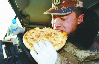 图三:抗饥饿训练期间啃馕饼的驾驶员