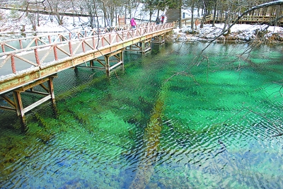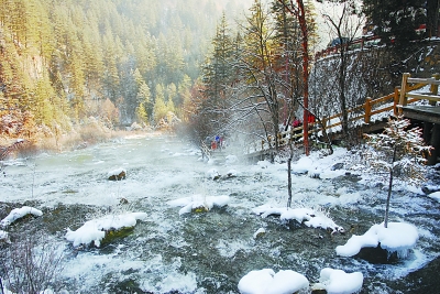皑皑白雪盖不住青山绿水,九寨沟的雪味浓郁而色彩丰富,这正是它与北方雪景的不同之处。冬季的九寨,繁花落尽,绚烂犹在。