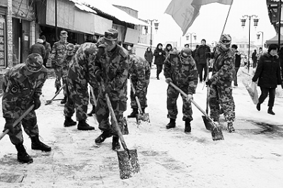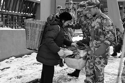 1月21日,海拔1700米的凤凰山盘山公路上,数十辆货运和客运车辆滞留,司乘人员倍感焦急。武警贵州总队织金县中队接到增援命令后,火速赶往凤凰山。抵达现场后,中队官兵与交警部门一道撒盐除冰,疏通车辆。为了尽快打通交通生命线,官兵们有的手被磨破,有的脚被冻伤,有的多次摔倒,但没有一个人后退。