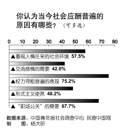 本次调查显示,75.2%的人认为应酬普遍是权力寻租普遍的表现;67.7%的人认为应酬是“职场公关”的需要;57.5%的人认为应酬源于重视人情往来的社会环境;48.2%的人认为应酬普遍是形式主义使然;42.0%的人认为应酬是交流感情的需要。