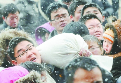 2月9日,一位旅客扛着行李挤在人流中。当日,中原地区降下今年的第一场雪。由于正值节后春运高峰,郑州火车站采取多项措施,确保旅客安全、顺利踏上归程。
