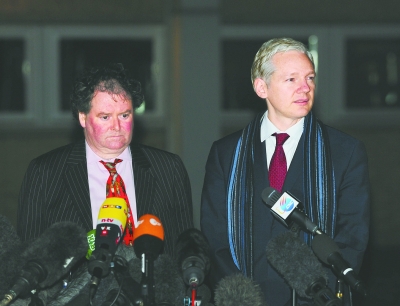 2月8日,在英国伦敦东南部一座法院,“维基解密”创始人阿桑奇(右)与他的律师在听证会后接受采访。