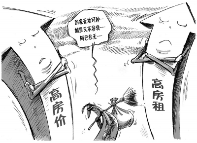 春节后,北京、上海、广州等一线城市的房租持续上涨,住房、商铺、写字楼的租金都上涨了10%左右不等,一些无房户买不起又租不起。(《南方日报》2月16日)漫画:徐简