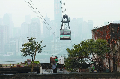 住在二虎崖的张宗伶,房子虽然破旧,屋里却被主人收拾得干干净净、井井有条,进门还得脱鞋。她住的这片老区即将进行旧城改造,但因为拆迁补偿费的事情,还存在不小争议,她与周边几户人家还迟迟未搬。楼阁有两间屋子,只有大半人高,一间是儿子住的,窗边放着一台电脑,窗户上挂着两盏灯笼,显出些许过年的节日气氛。打开窗户,伴着滑轮滚过的“沙沙”声,一辆索道车厢从头顶上穿过。张宗伶说,她在这里住了近40年了,这里也算得上是老重庆的缩影。1987年10月长江索道建成通车后,索道就成了她家头顶过往的常客。索道每天来回运行,仿佛钟摆一样,慢慢地把时间推到了2011年农历辛卯的春节。经历了20多年的风雨,站台楼依然屹立在张宗伶家身后的山坡上,不远处一座名为“联合国际”近300米高的写字楼已经初具规模。