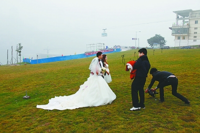2月8日农历正月初六,不少新人穿着礼服,来到位于江北嘴的重庆大剧院前拍婚纱照。重庆大剧院是重庆的新地标建筑,是新重庆的象征,附近规划中的CBD正如火如荼地建设着。嘉陵江索道北站台孤零零地竖立在工地的乱石堆旁。