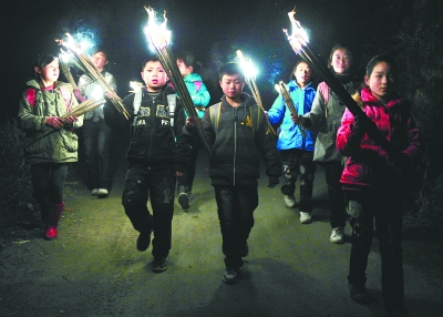 2月21日凌晨5时30分,家住陕西省安康市紫阳县瓦庙镇堰塘村的孩子们打着火把,顶着寒风,走在上学的山路上。他们通常要花两个多小时,才能走到校园。
