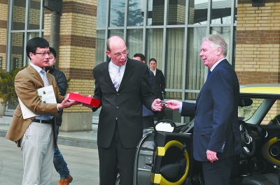 2月23日,德国驻华大使施明贤博士(右)从宝马大中华地区总裁史登科博士手里接过MINI E电动汽车的钥匙,德国驻华使馆因此成为首个驾驶电动汽车的德国驻外代表机构。