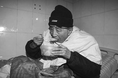 2011年的大年三十晚上,丁邦杰又来到养老院看望老人。老人已经不清楚这天是什么日子了。这天晚上,养老院的晚餐是一碗水饺和一盘大白菜炒肉片,老人用颤抖的右手夹起水饺,低着头往嘴里送。