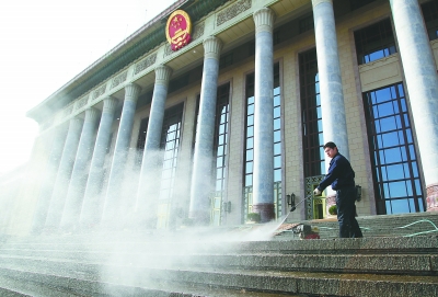 2011年2月28日,人民大会堂的工作人员在清洗台阶,准备迎接两会召开。杨登峰摄