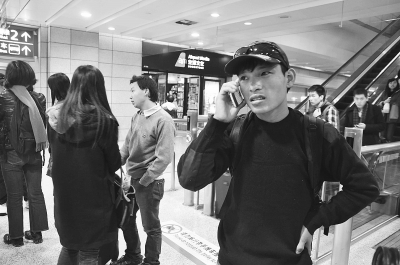 “泰源227号”最小的中国籍船员黄忠科在机场给家人打电话报平安。本报记者 周凯摄