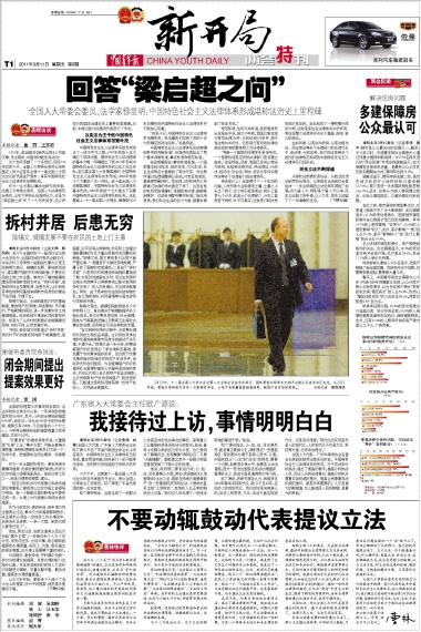 今天下午,出席第十一届全国人大四次会议的各代表团召开会议,审议全国人大常委会工作报告。欧广源是广东省代表团的第一位发言者。
