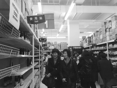 记者在沃尔玛等大型超市,看到其他柜台前都门庭冷落,只有在卖盐的柜台前拥堵了很多人,大家边议论边等补货。有些24小时连锁便利店的食用碘盐在昨天夜里就被抢购一空,连一些小卖部,本来是店家留着煮茶叶蛋的盐也都被买走了。