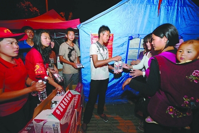 3月14日,志愿者在盈湖公园安置点发放矿泉水。